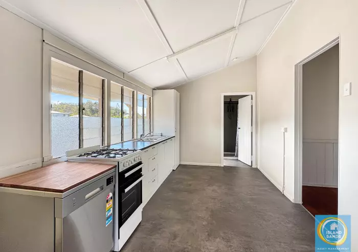 - Kitchen with freestanding gas cook top and electric dishwasher