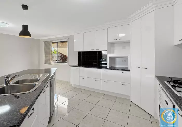 - Kitchen with gas cooktop, electric oven, dishwasher & island bench